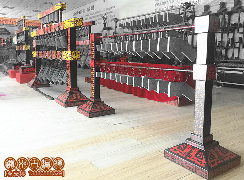 公司復(fù)原制作的24音編磬全長1.8米,寬50厘米,高1.1米;演奏方便,音色亮麗,公司設(shè)計了編磬木桌放置編磬,長2米,高70厘米,寬60厘米,陳列編磬后總高度:1.8米。木桌內(nèi)做儲藏柜,可方便樂隊保管其他樂器及服裝,方便實用。