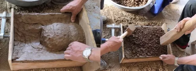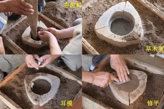 夯范:將模固定好,表面撒上一層黑煙灰做脫模劑,填入泥料層層夯實,脫模后修整,陰干即可。
